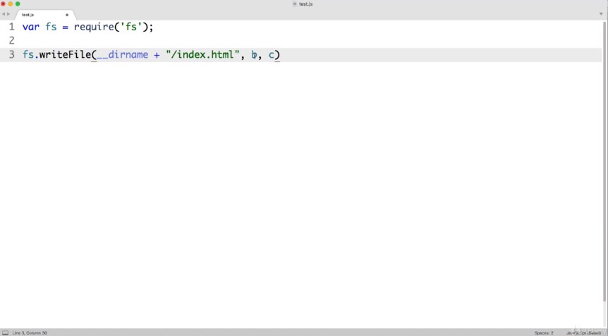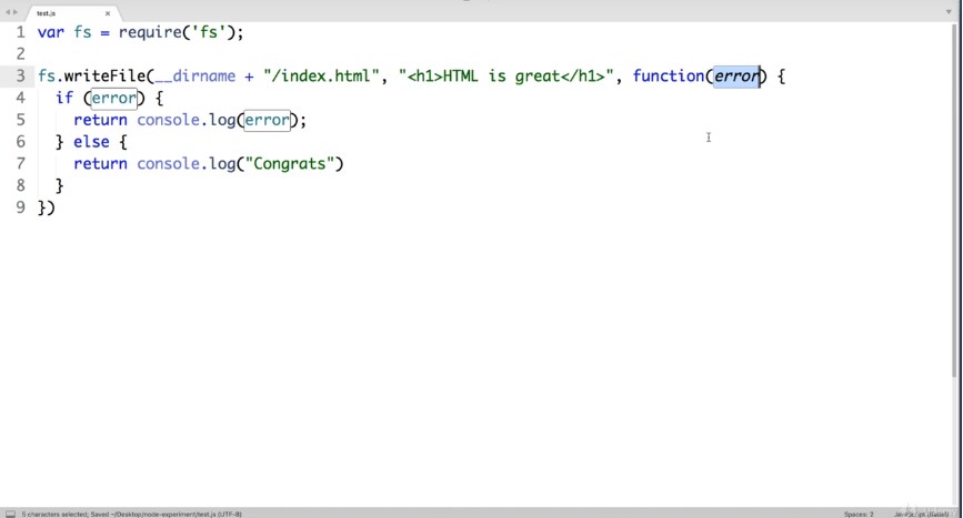 OK and then finally for the third argument instead of this placeholder see we want to include a function that will run once our write file action has either succeeded or failed. This is commonly referred to as a callback function.