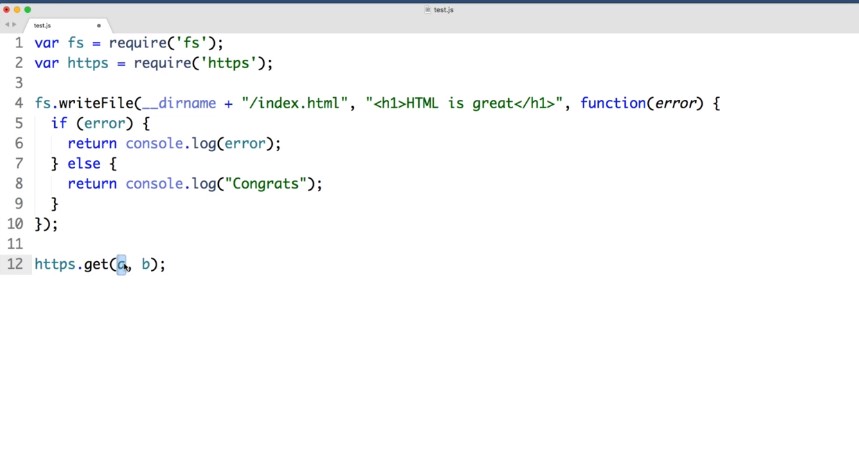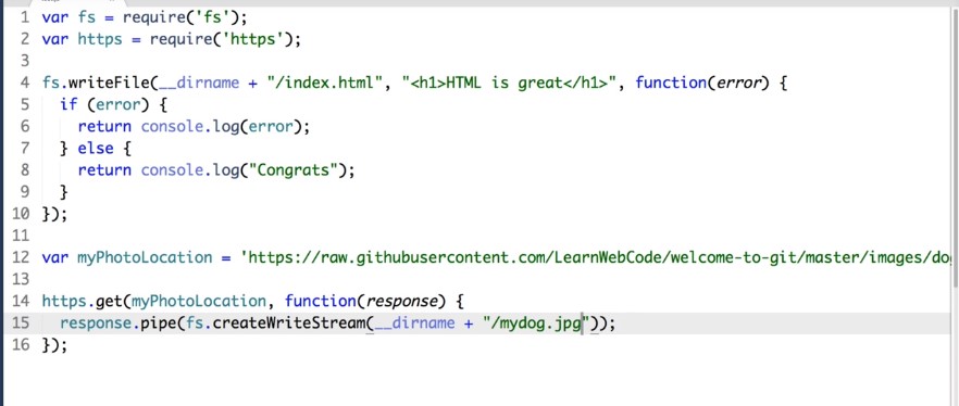 And if I check my folder sitting alongside or tes.js we now see index.html, and if I open it up in my text editor cool we can see that it contains our content. Now let’s change gears and try one more note example before we bring this lesson to a close. So up next let’s make it our goal to use node to programmatically download and save an image from the Internet.