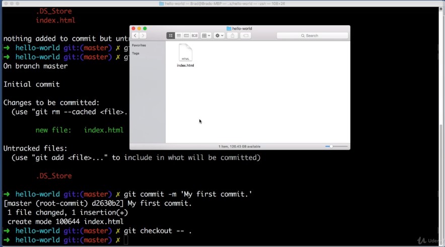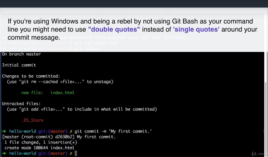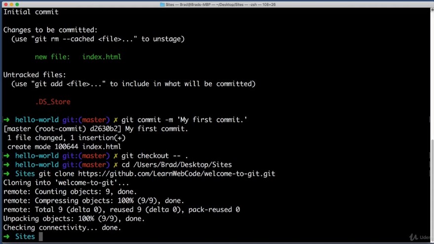 And we made our first commit. Now really quickly I want to point out that we created a brand new repo from scratch. And while that can be useful I think more often than not what you’ll do instead is you want to clone an existing Repo from a server to your hard drive.