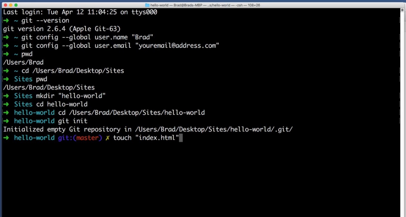 Hit enter and you’ve just created your first repo. Let’s test it out. Let’s make sure that it’s tracking changes so let’s create a super simple HTML file we can actually create new empty files from the command line by typing touch and then the name of the file that we want to create.