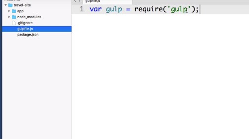So we do that by typing var. We just want to create a variable. We could actually name this variable anything we like but let’s name it gulp. Just to stay sane.