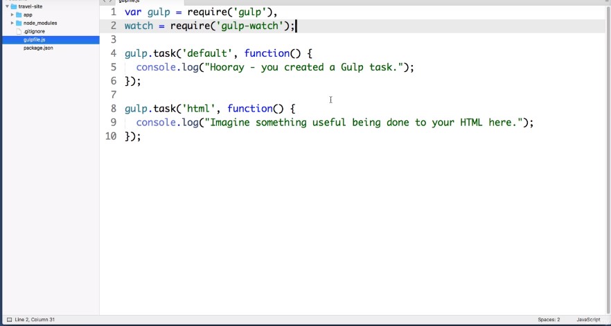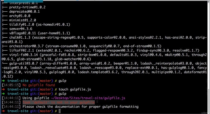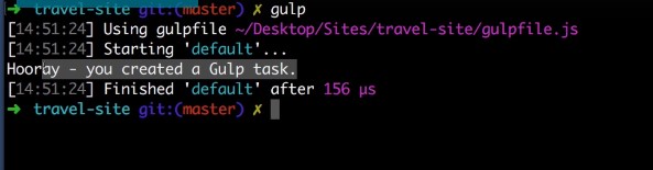 I think it will become clearer over time as we work our way through the course and continue to install more and more packages for the time being. Let’s pat ourselves on the back because we have just installed gulp to prove it. Go over to your command line and simply type gulp and hit enter.