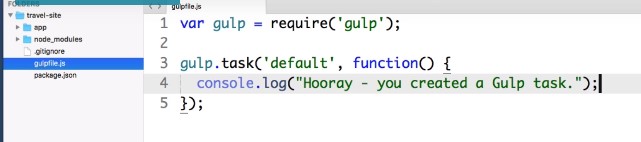 console.log(“Hooray – you created a Gulp task.”);