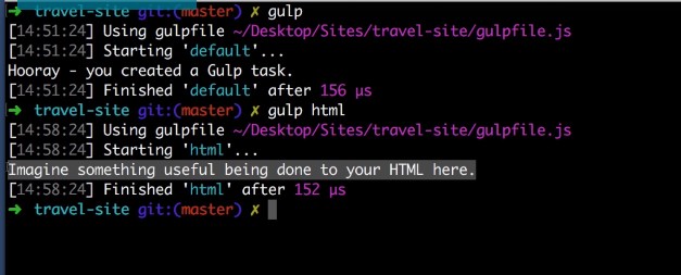 Now to run the default gulp task you just type gulp. But we can also run specific tasks by typing gulp space and then the name of the task. So we just created a task named HTML which is go ahead and run it and there it is.