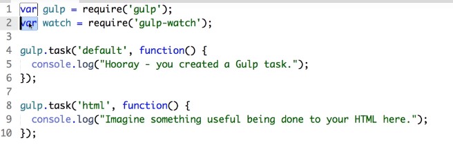 Now granted in real life you will probably do something more useful than just logging a bit of text to the command line but you get the idea. It’s very unlikely that you would only have one gulp task. So let’s practice creating another task. So gulp we want the task method to create a new task.