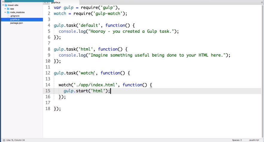 The second argument that this watch function takes is what we want it to actually do. So we will create an anonymous function. So whenever we save a change to this HTML file what’s automatically trigger our HTML task to do that we just type gulp start and then the name of the task we want to start.So each team go ahead and save that.