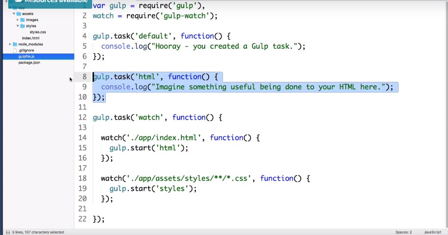 So it’s create an anonymous function and we just want to trigger a new gulp tasks. Let’s say gulp start. Now we haven’t created this task yet but let’s say styles and then really quickly up here. Let’s just copy this HTML task paste it and just change this to styles.