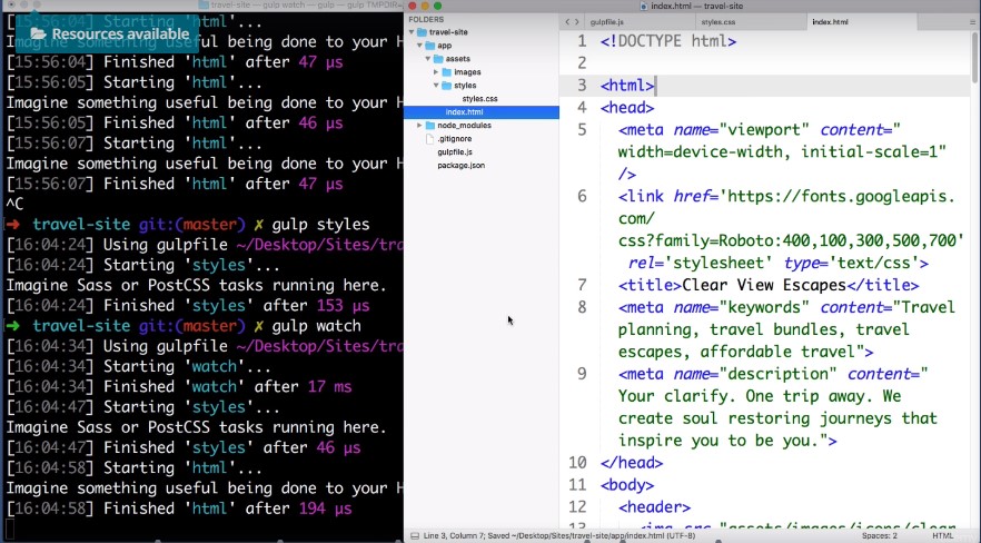 As soon as we hit save on that file our HTML task was automatically triggered by gulp. And if we go back to our text ditor and save again and again and again you see that each time instantly gulp reruns that task we can tell go up to stop watching by in the command line pressing control-C.